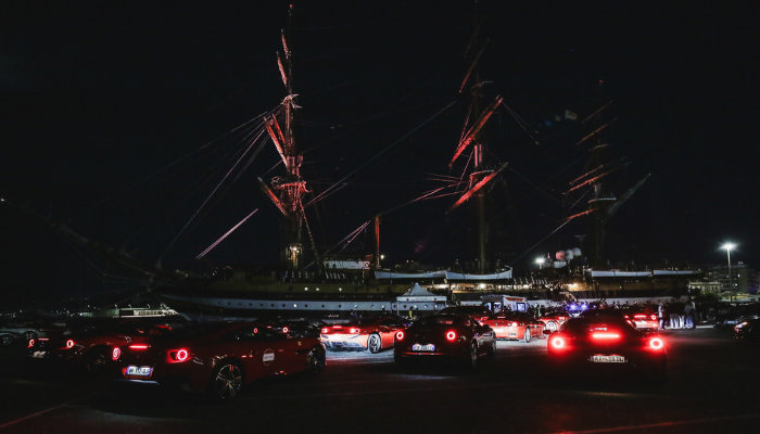 Parking of the Ferraris in front of the Amerigo Vespucci sailing ship immediately after disembarking from the ship in Palermo. Photo by Fabrizio Gandini.